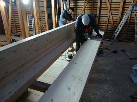 今回の現場では、解体工事と梁刻みの作業を進めています。