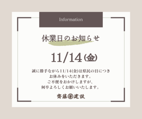 誠に勝手ながら、11月14日(金)は「埼玉県民の日」に伴い休業いたします。ご不便をおかけいたしますが、何卒よろしくお願い申し上げます。